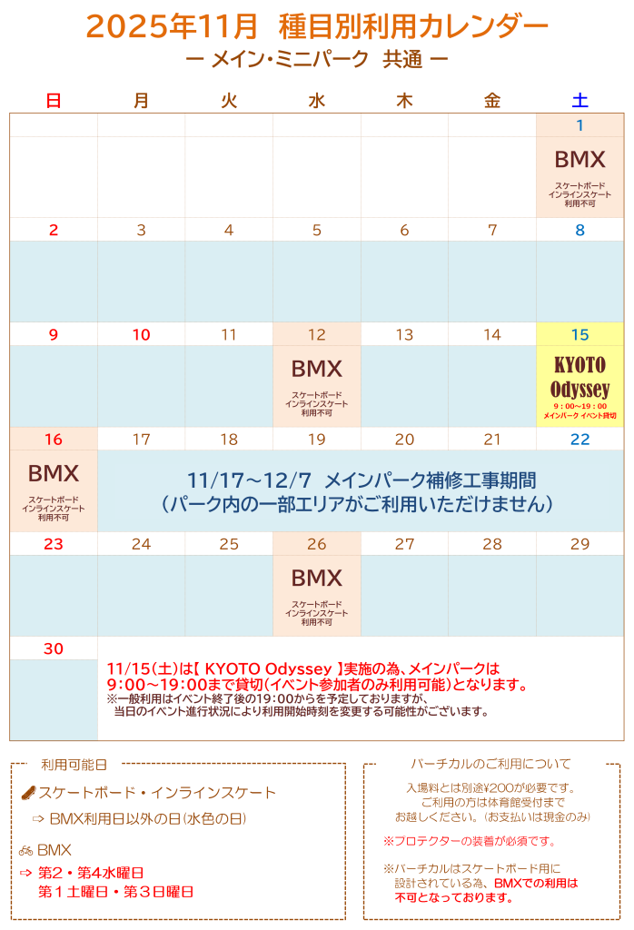 【重要】アーバンスポーツパーク 2025年11月 各種目ごとの利用日について